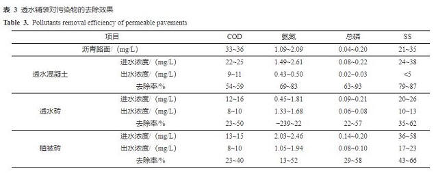 本研究中透水鋪裝建成2年,使用年限較短,對污染物的去除效果明顯。有研究證明,隨著使用年限的增長,透水鋪裝去除污染物的效果會逐步下降[25],但是通過清洗,可使透水鋪裝材料中污染物(特別是COD和氨氮)溶出,使其對污染物的去除效果有所恢復。因此,透水鋪裝工程應及時清洗維護,以保持其污染物去除效能[26]。