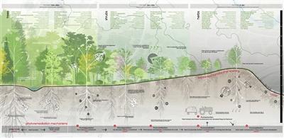 董珂等人在獲獎作品中采用的是植物修復(fù)的技術(shù)修復(fù)“棕地”土壤,即利用高效累積植物的生長活動,將土壤污染物吸收轉(zhuǎn)移進(jìn)入植物體,然后對植物進(jìn)行收割和處理,從而實現(xiàn)修復(fù)污染土壤的目的。而這種“修復(fù)”,則體現(xiàn)了“城市雙修”的理念。