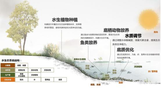 通過底質優化、水生植物構建、水生動物群落構建、水質調節等營造青草型水生態系統。采用“氣浮+生化+過濾”綜合治理工藝去除水體中的藻類、顆粒物質。