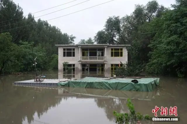 7月31日,北京市房山區竇店鎮蘆村,臨近大石河的一座尚未完工的房屋被淹。