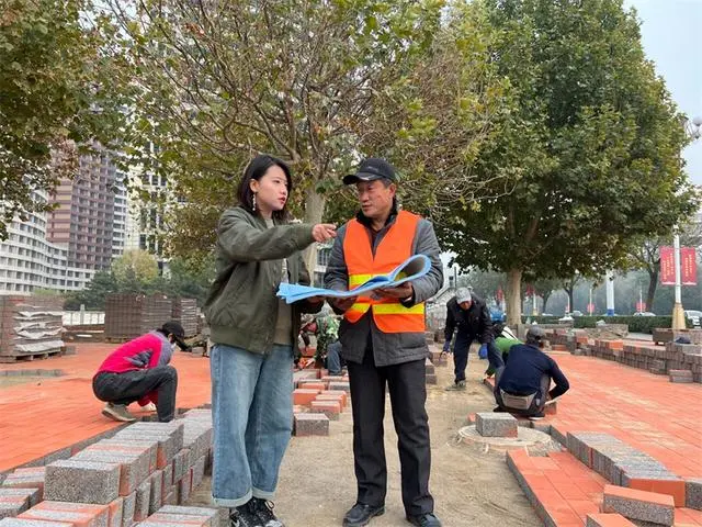 11月15日,在唐山市北新道海綿化改造施工現場,中國市政工程華北設計研究總院駐唐技術咨詢工程師劉昊妍(左)與施工方探討進度方案。
