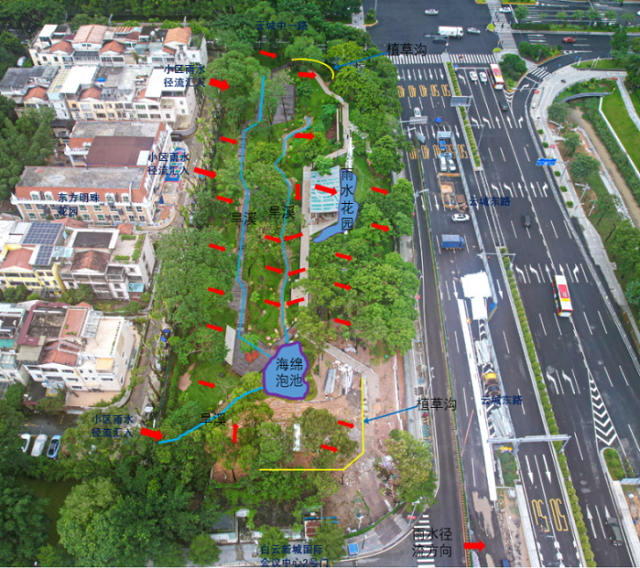 為解決以上問題,本項目因地制宜設置植草溝、透水鋪裝、旱溪、蓄水池等海綿設施,起到源頭減排、過程控制、末端治理回用效果,并充分發揮公園綠地對雨水徑流消減及過濾凈化的作用,減少周邊市政管網及下游河道排水壓力。