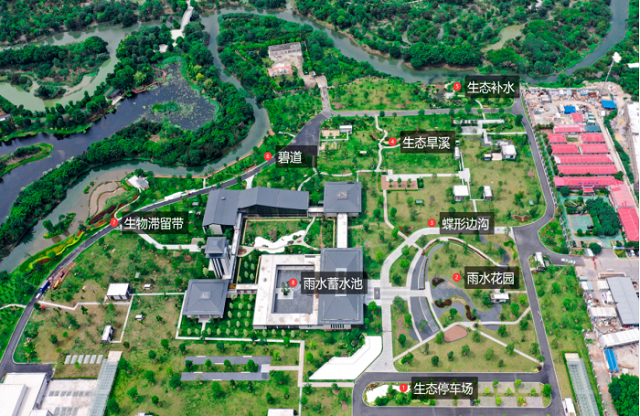 本工程主要采用下沉式綠地、綠色屋頂、透水鋪裝、雨水花園、植草溝等低影響開發措施,對排水系統、綠地花園系統等部分進行海綿化建設。雨水通過下滲減排、滯留轉輸等海綿化措施,平均污染削減率為78.1%。