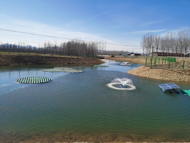 嘉祥縣水務局副局長王新榮介紹:“我們在每一處坑塘都配套了太陽能曝氣設備,增加水氧含量,打造‘凈水、增氧、控藻’的多功能復合生態系統。同時,修建回流井,在陰雨天及夏季高溫天氣啟動運行,補充水體流通,促進水系循環,提升水體自凈能力。”