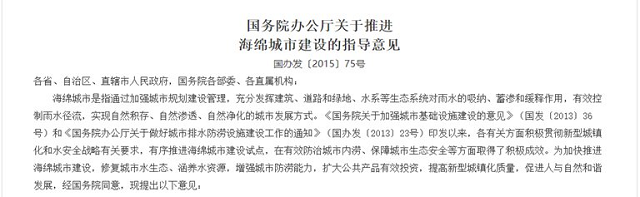 國務(wù)院辦公廳2015年10月印發(fā)《關(guān)于推進(jìn)海綿城市建設(shè)的指導(dǎo)意見》(國辦發(fā)﹝2015﹞75號(hào)),部署推進(jìn)海綿城市建設(shè)工作。
