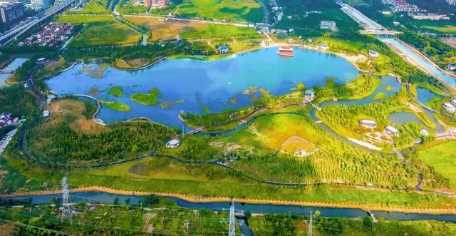 三期項目總面積約60公頃,其中總水域面積達27公頃。水域周邊,植被茂盛,環湖道路曲徑通幽。湖邊低洼處的雨水花園,下雨天雨水匯聚在此,當流到中間的大湖時,湖邊的蘆葦、荷花以及水草等植物,則發揮了凈化雨水的作用。