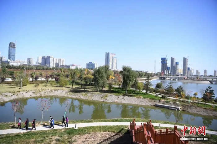 2020年10月22日,甘肅慶陽市“海綿城市”雨水蓄水地西峰區(qū)南湖吸引市民游玩。中新社記者楊艷敏攝