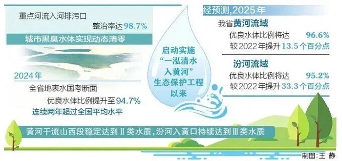 為推動黃河流域水生態環境整體改善,我省深入推進碧水保衛戰。強化水資源、水環境、水生態“三水”統籌,啟動實施“一泓清水入黃河”生態保護工程,重點河流入河排污口整治率達98.7%,城市黑臭水體實現動態清零。2024年,全省地表水國考斷面優良水體比例提升至94.7%,連續兩年超過全國平均水平,黃河干流山西段穩定達到Ⅱ類水質,汾河入黃口持續達到Ⅲ類水質。