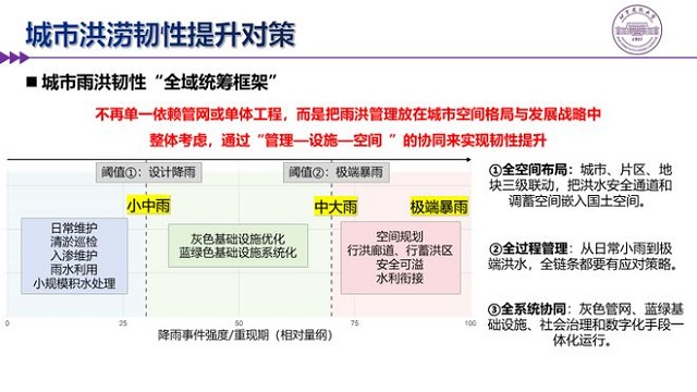 全過程管理:建立從日常小雨的源頭消納,到中大雨的過程轉(zhuǎn)輸,再到極端暴雨的安全應急行泄,覆蓋所有降雨情景的全鏈條應對策略。